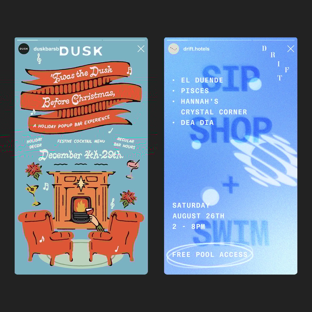 Drift Hotels is a distinguished chain of boutique establishments situated in Baja California, Santa Barbara, Palm Springs, and Nashville. I have had the privilege of collaborating with Drift Hotels to create an exclusive Maleza bar menu for Thursday nights at the Palm Springs Art Museums. Furthermore, I have designed a Halloween-themed bar menu for Dusk Santa Barbara. Additionally, I have crafted engaging Instagram Story content to promote diverse events hosted by Drift PS and Dusk SB.
