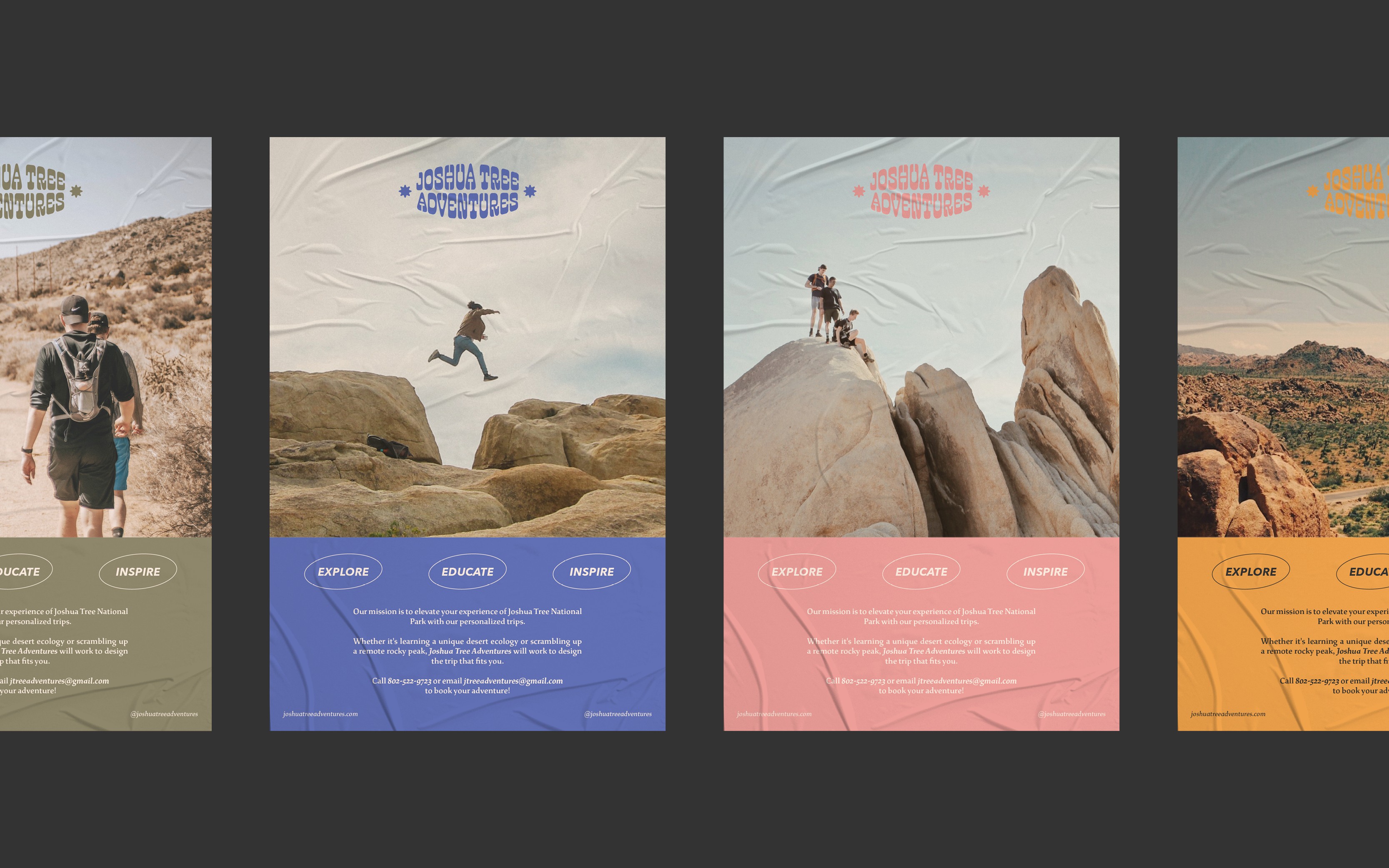 Joshua Tree Adventures is your gateway to a tailor-made, guided experience, unveiling the splendors of Joshua Tree National Park. I collaborated closely with JT Adventures to craft their brand identity and develop comprehensive marketing materials, ensuring a seamless and enticing representation of the unique journeys they offer.